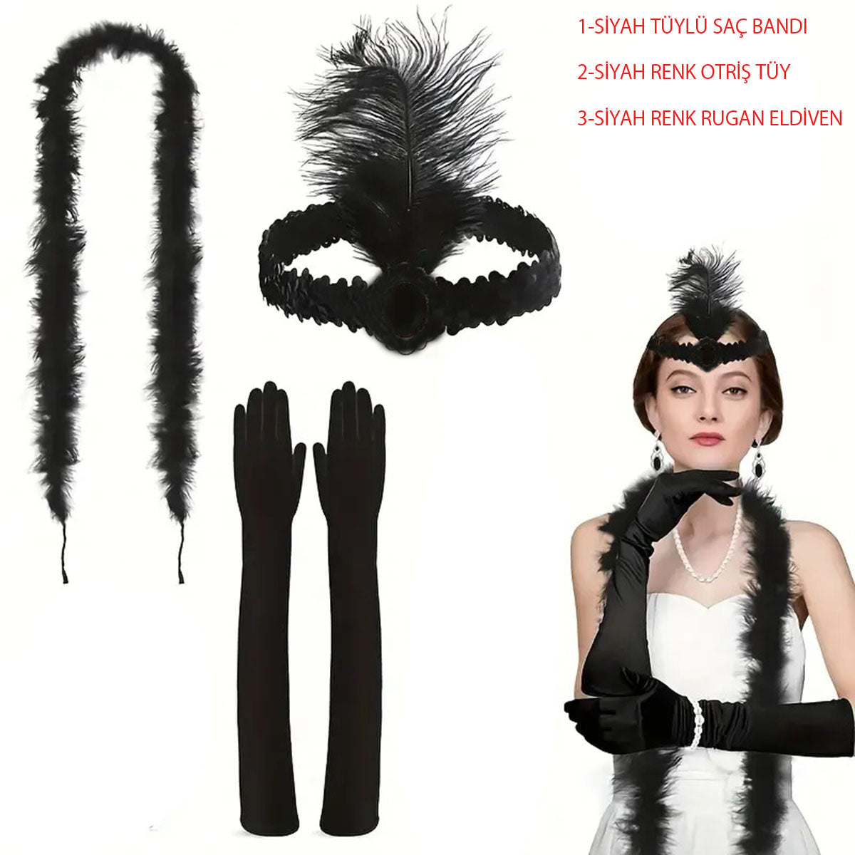 1920’LER TARZI SİYAH TÜYLÜ SAÇ BANDI, RUGAN SİYAH ELDİVEN VE SİYAH OTRİŞ SETİÜrün Özellikleri