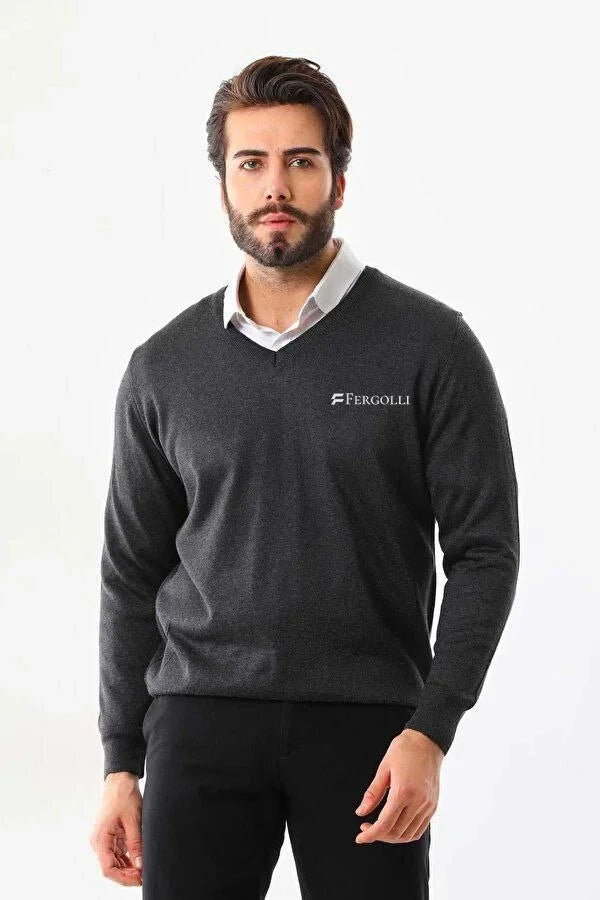 Baskılı V Yaka Uzun Kol Dokuma Triko - Indigo