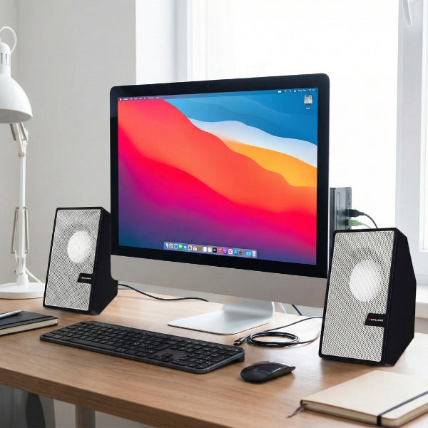 Kompakt tasarımı sayesinde masaüstünde fazla yer kaplamaz, beyaz ön yüz tasarımı ile modern bir görünüm sağlar. Üzerindeki ses kontrol düğmesiyle sesi hızlı ve pratik şekilde ayarlayabilirsiniz. Şık, hafif ve kullanışlı yapısıyla günlük kullanımda ideal bir ses çözümüdür.