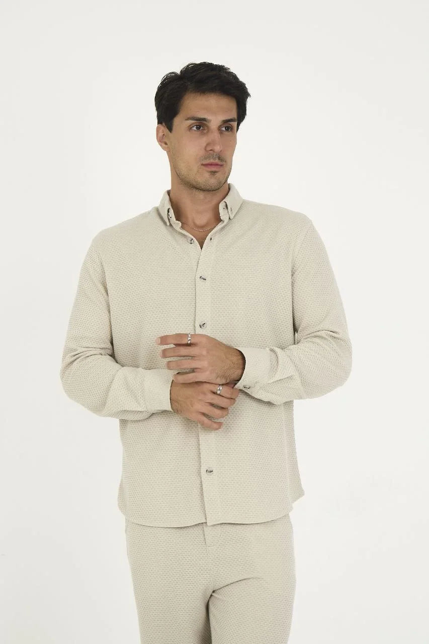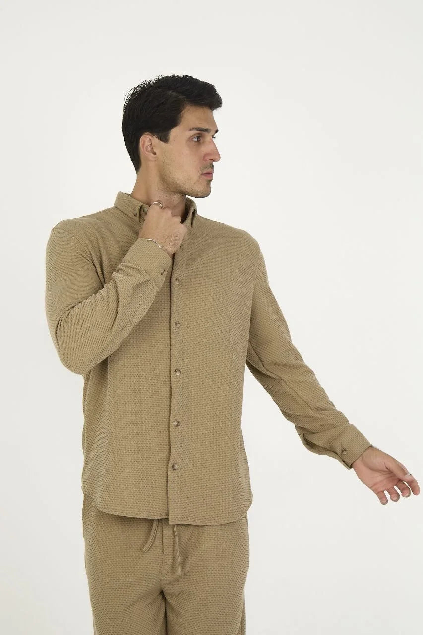 Düğmeli Tam Kalıp Uzun Kol Jakar Gömlek - Kahverengi