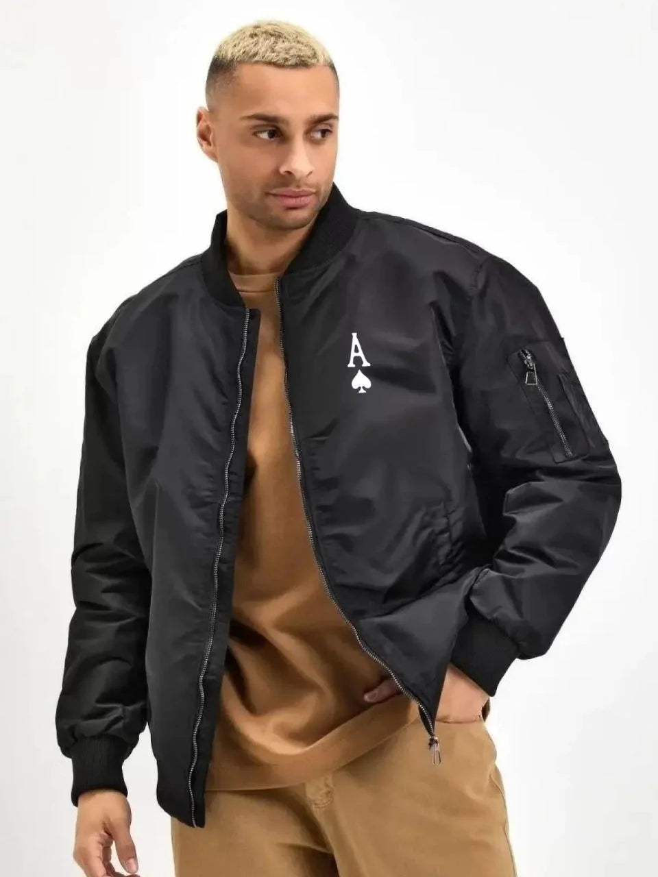 Erkek Bomber Mont – Siyah Renk, Maça Ası Baskılı, Fermuarlı, Cepli, Kapitone Astarlı, Bahar Kış Günlük Mont Ceket - Siyah