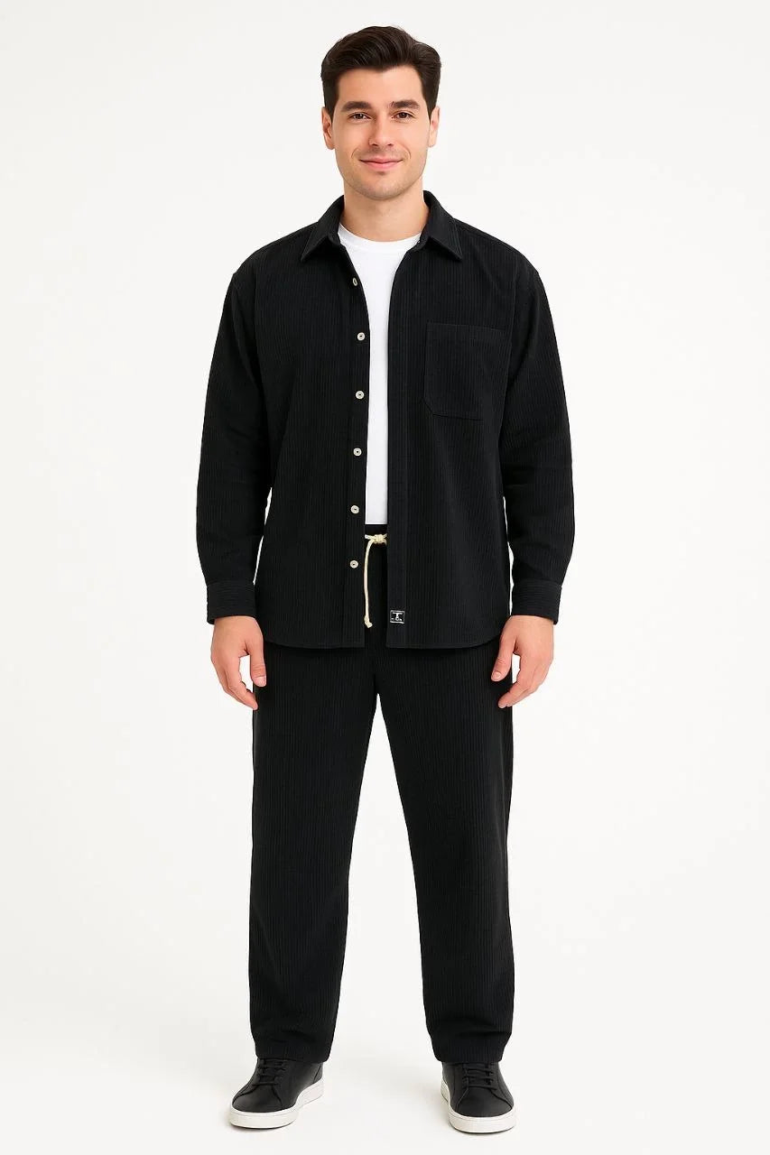 Erkek Kadife Oversize Takım – Gömlek ve Pantolon İkili Set Füme Corduroy Şıklığı, Rahat ve Zarif Duruş Yumuşak Dokulu Kadife Kumaş, Düğmeli Gömlek Üst ve Lastikli Pantolon Alt Parça ile Gün Boyu Konfor- Siyah