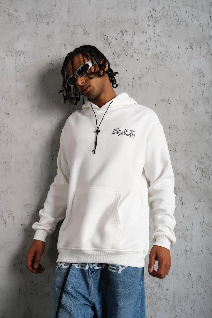 Erkek Oversize Üç İplik Kapüşonlu Sweat – Siyah Kol ve Etek Ribana Detaylı, Ön ve Sırt Baskılı, Kanguru Cepli Rahat Kalıp Model