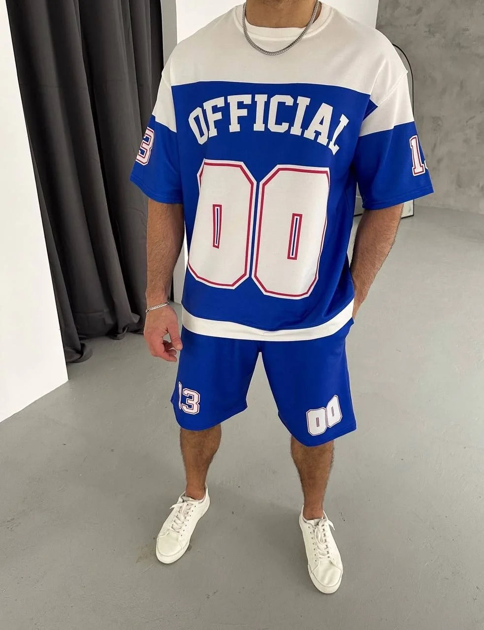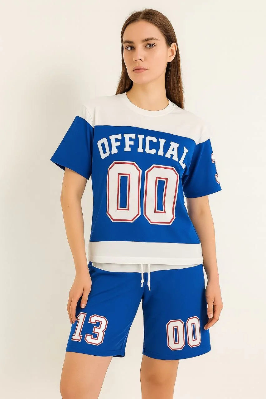 Erkek Şortlu Takım – Oversize İki İplik Kumaş, Ön & Arka Dijital Baskılı Tişört ve Lastikli Cepli Şort, Yazlık Günlük Spor Set - Mavi