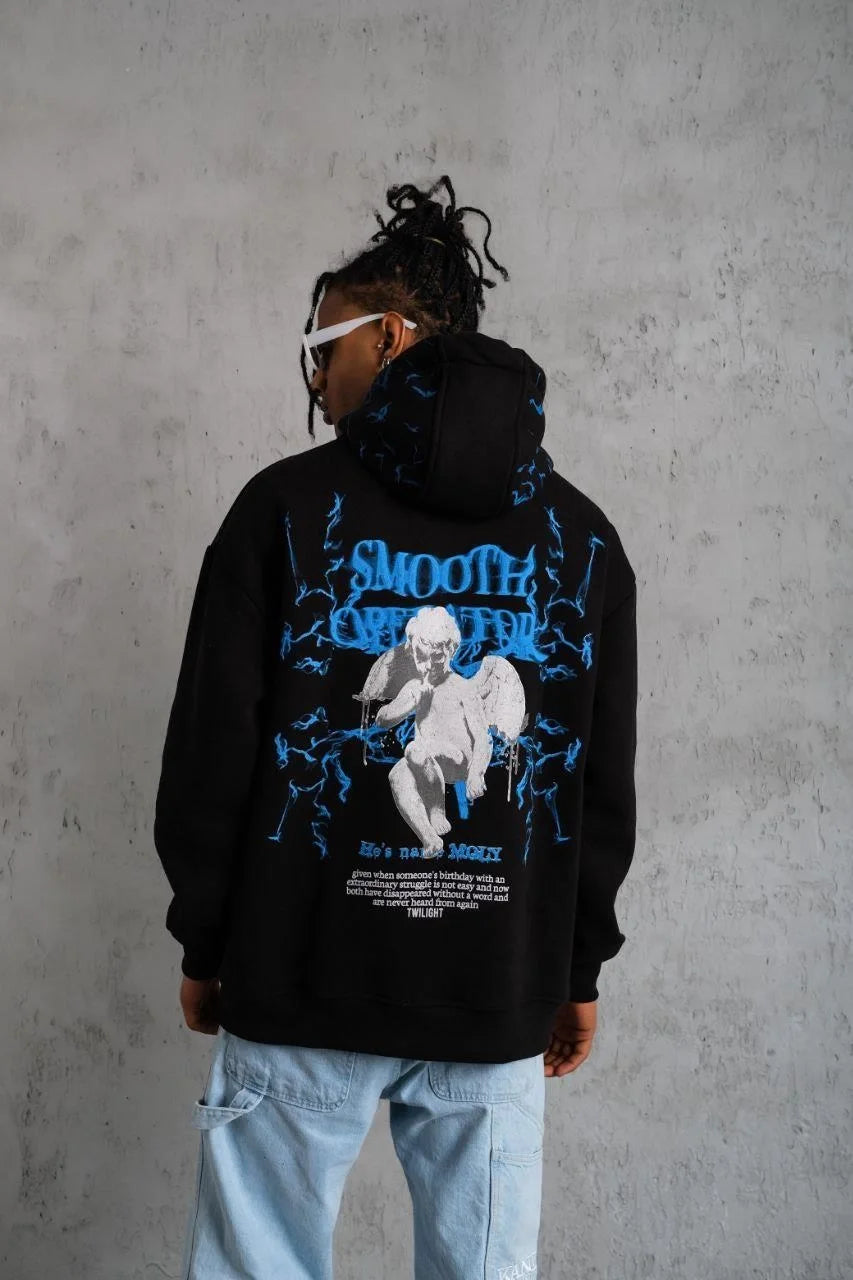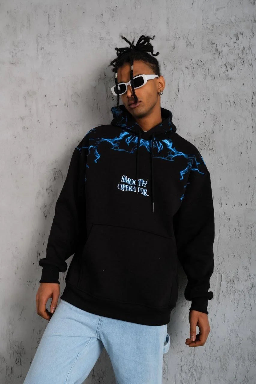 Erkek Yıldırım Baskılı Kapşonlu Sweat - Siyah