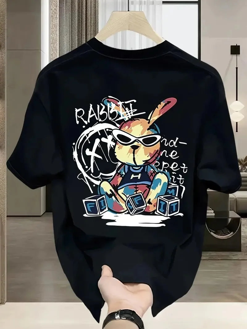 Güneş Gözlüğü Grafikli Karikatür Tavşan Oversize Kısa Kollu Tişört Çift Tişört, İlkbahar Ve Yaz- Siyah