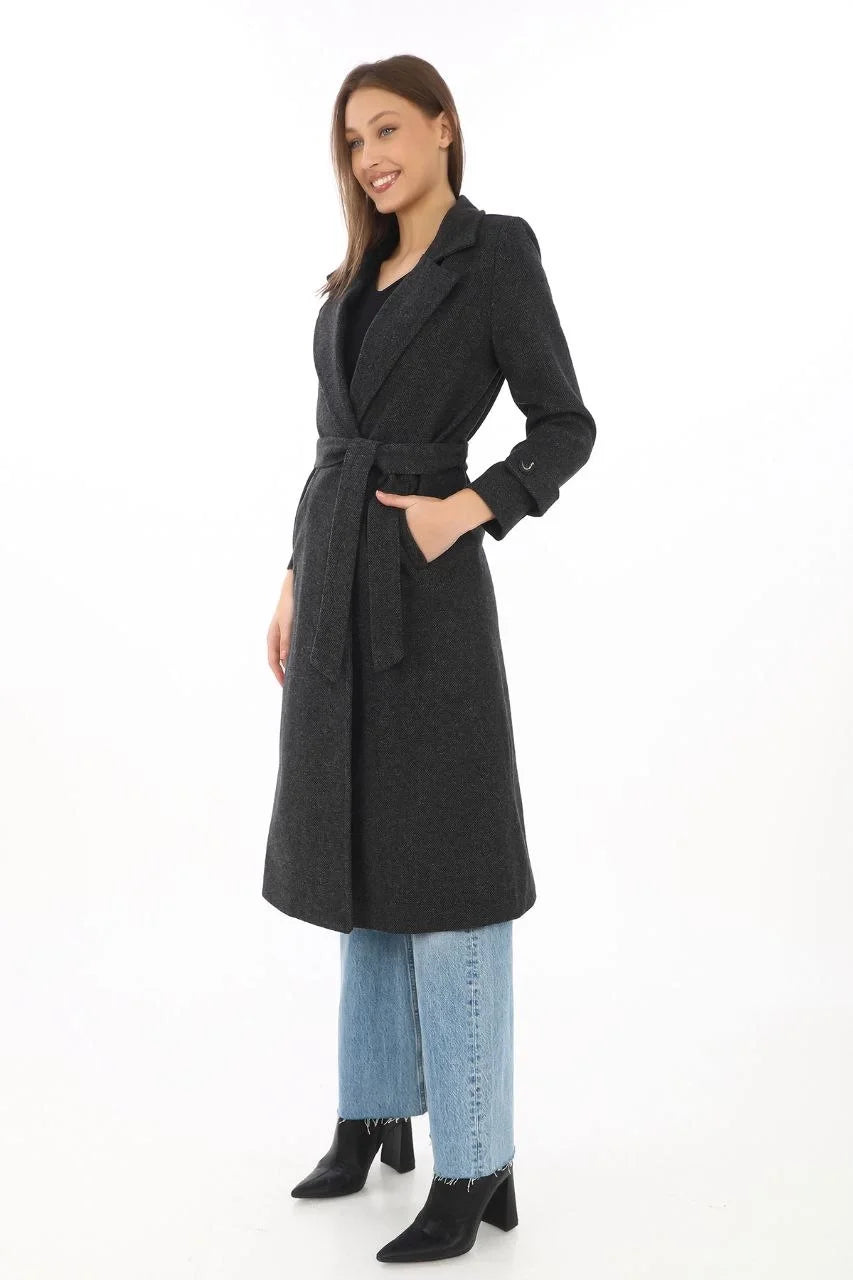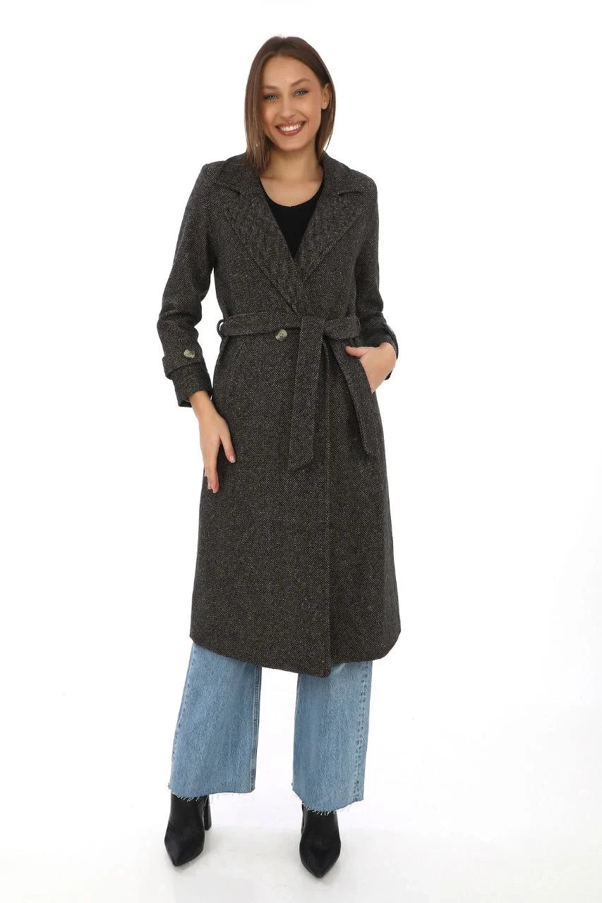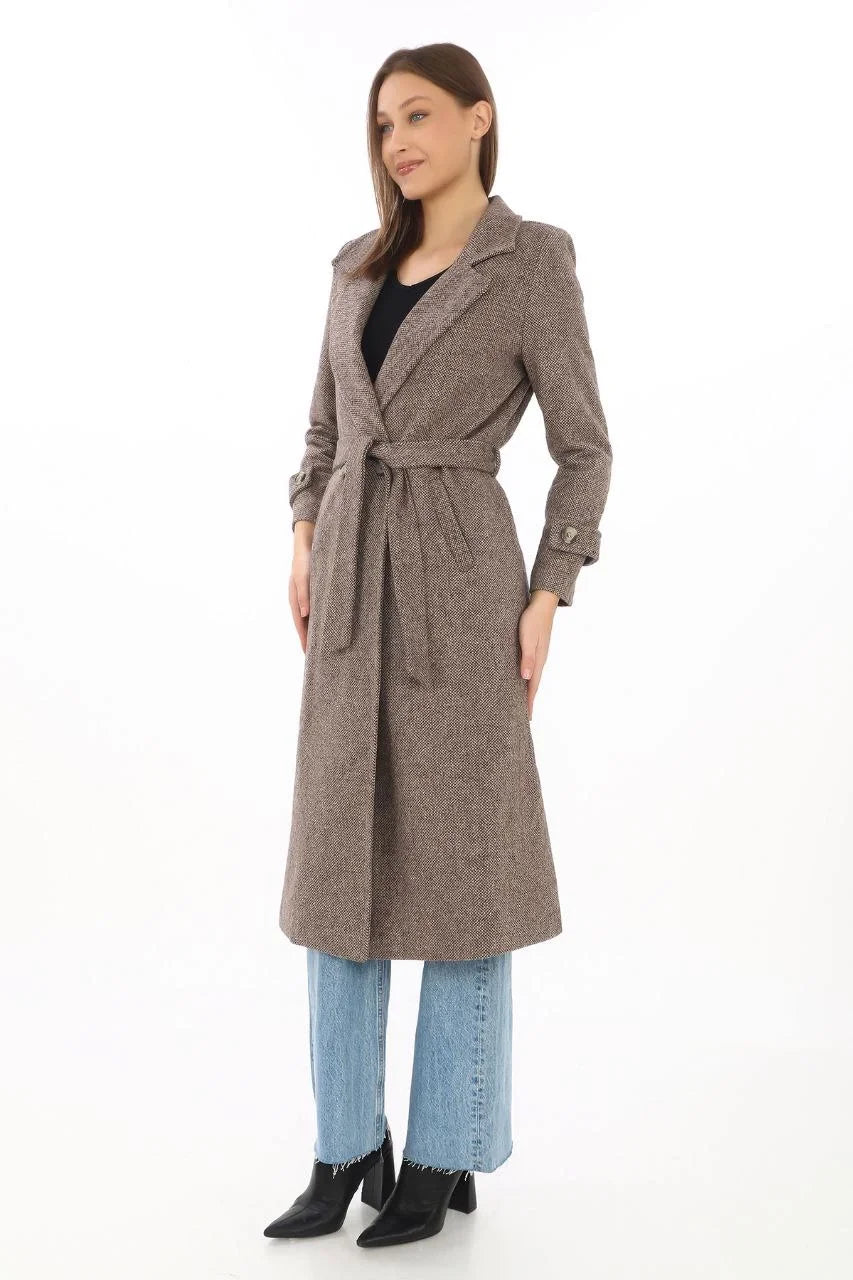 Kadın Astarlı Balık Sırtı Kaşmir Kaşe Kaban - Kahverengi
