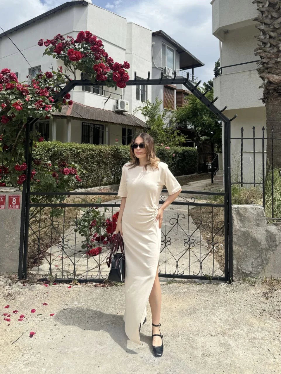 Kadın Kısa Kollu Uzun Yandan Yırtmaçlı Elbise - Bej