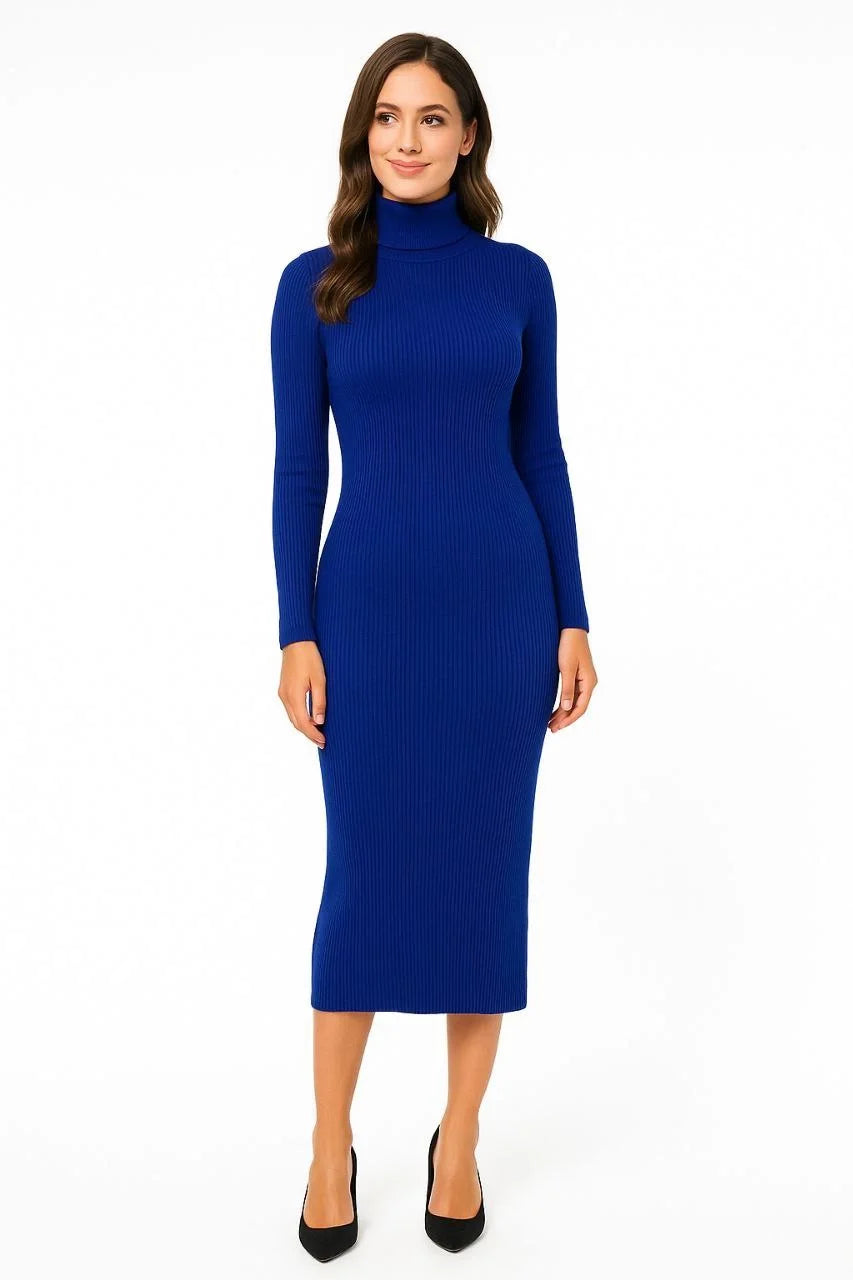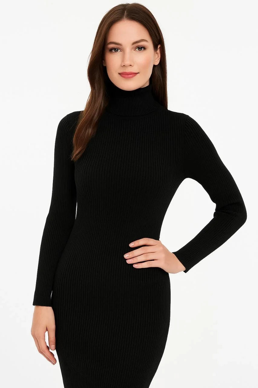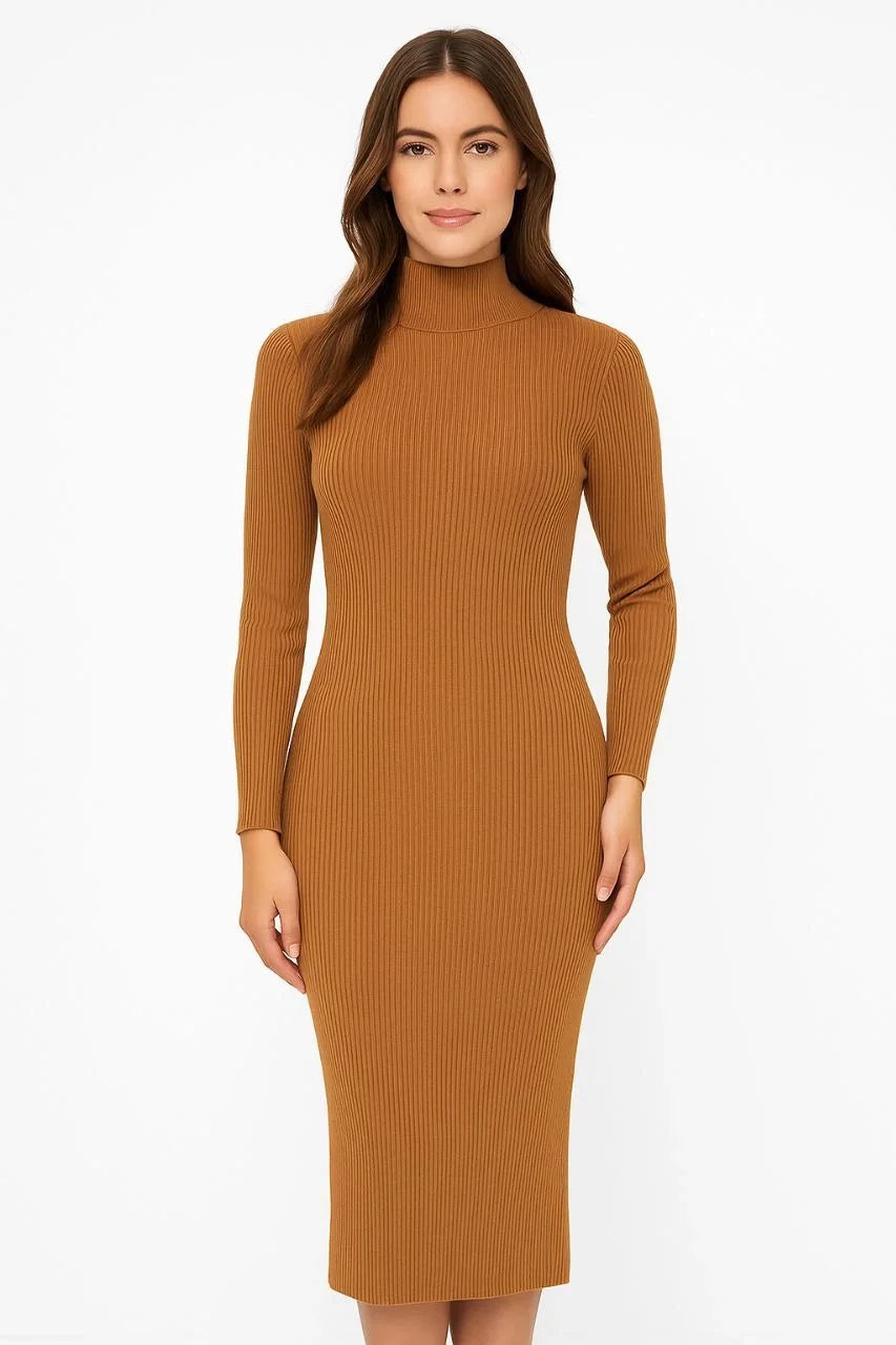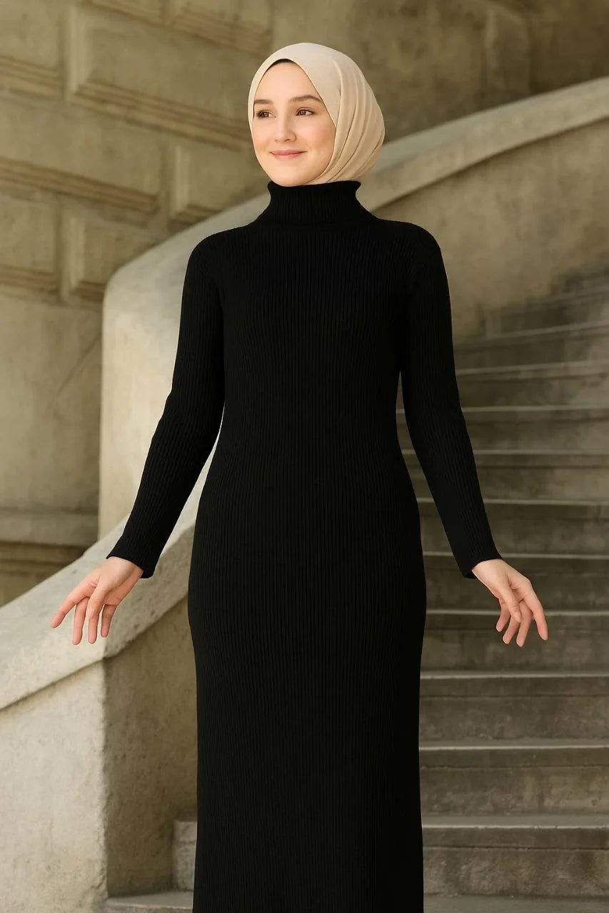 Kadın Tesettür Triko Elbise – Boğazlı Uzun Fitilli Dokuma, Esnek Tam Kalıp, 130 cm Midi Boy, Bahar & Kış Şık Rahat Stil - Kahverengi