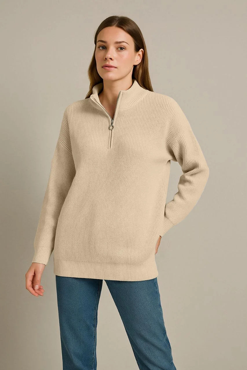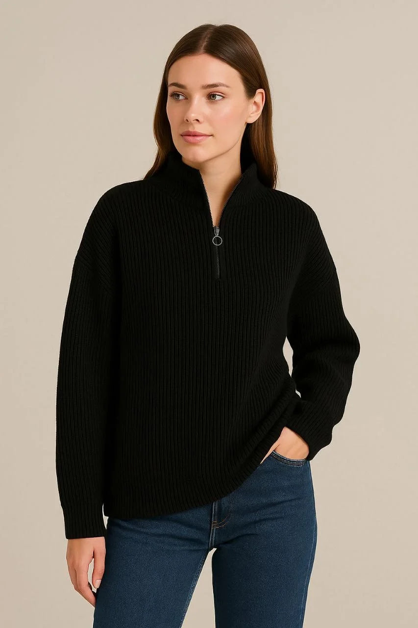 KADIN Yarım Fermuarlı Triko Kazak – Selanik Örgü, Dik Yaka, Pamuklu Dokuma, Oversize Uzun Kollu Kışlık Model - Siyah