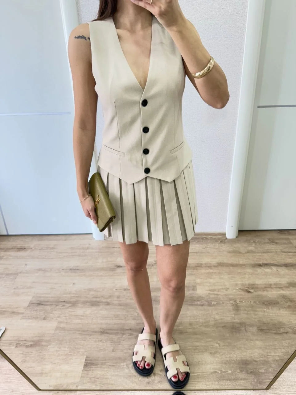 Keten Takım Görünümlü Düğme Detaylı Yelekli Mini Elbise - Bej