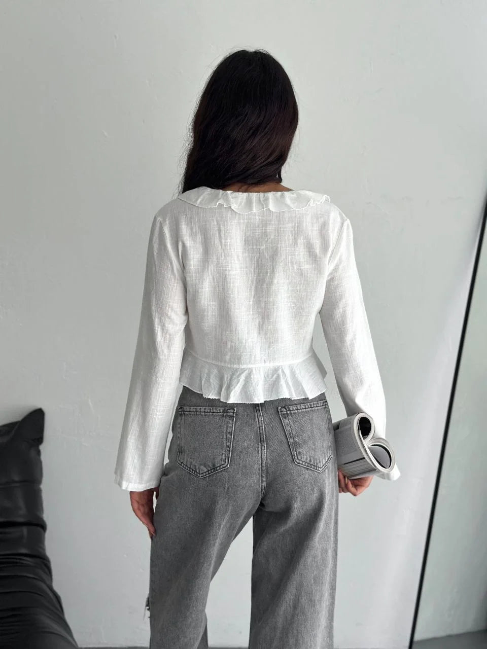 Keten Uzun Kol Bağacık Detaylı Bluz - Beyaz