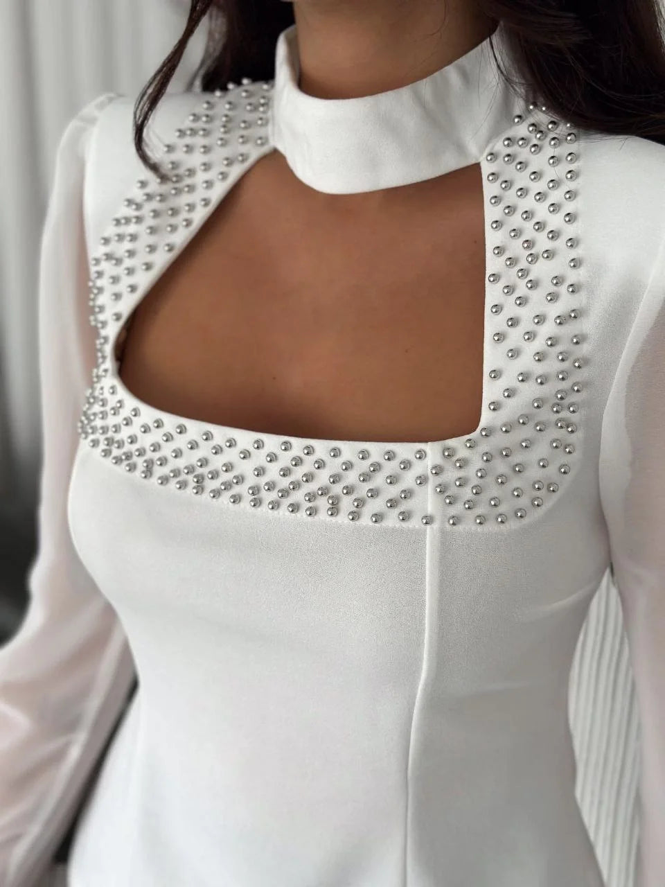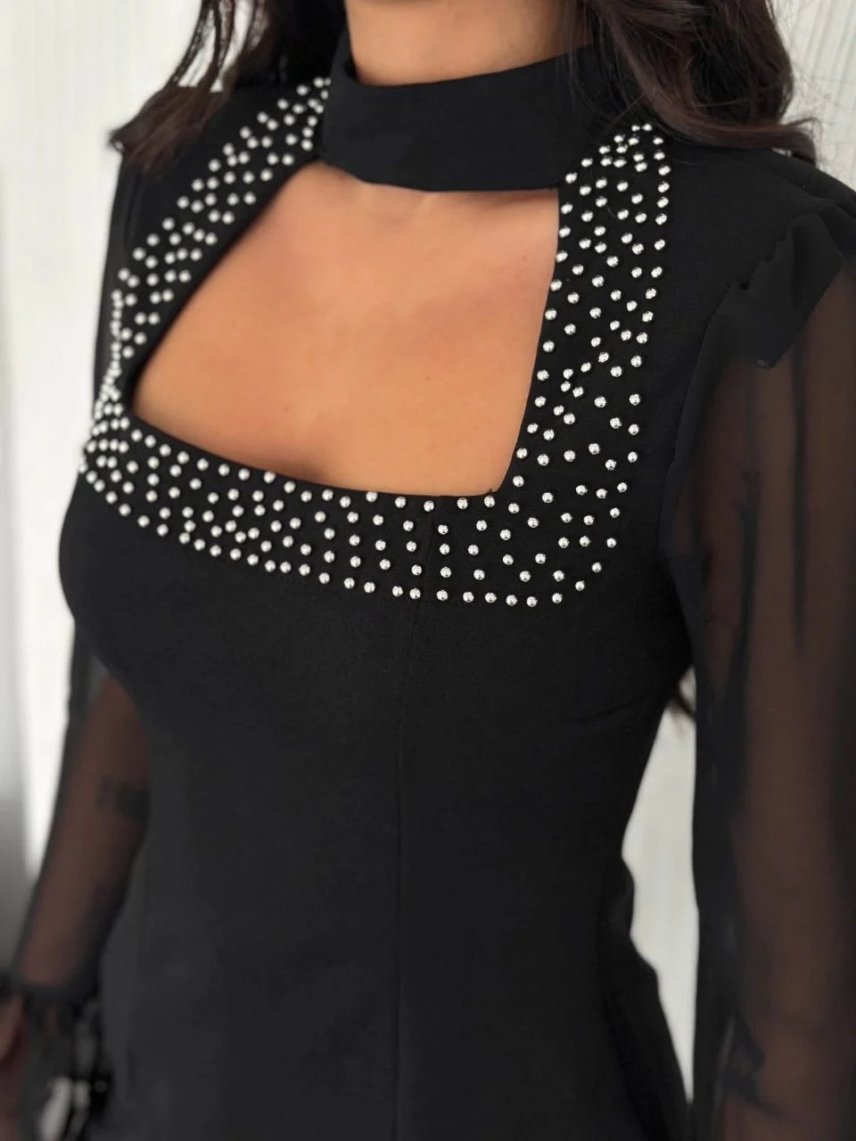 Penye Uzun Kollu Kadın Kolları Şifon Göğüste İnci Boncuk detaylı Bluz - Siyah