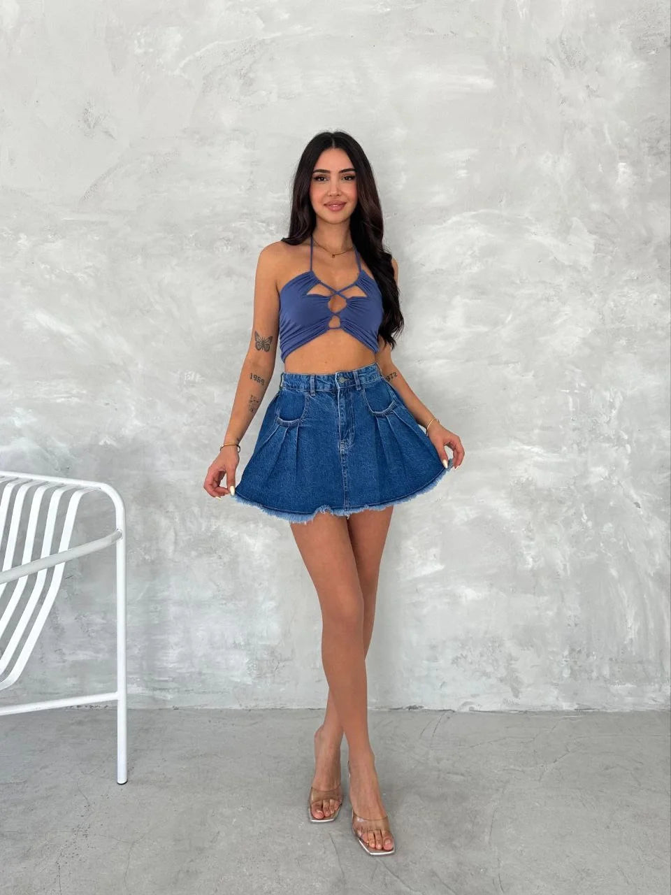 Şık Pileli Yazlık Mini Etekli Kot- Siyah