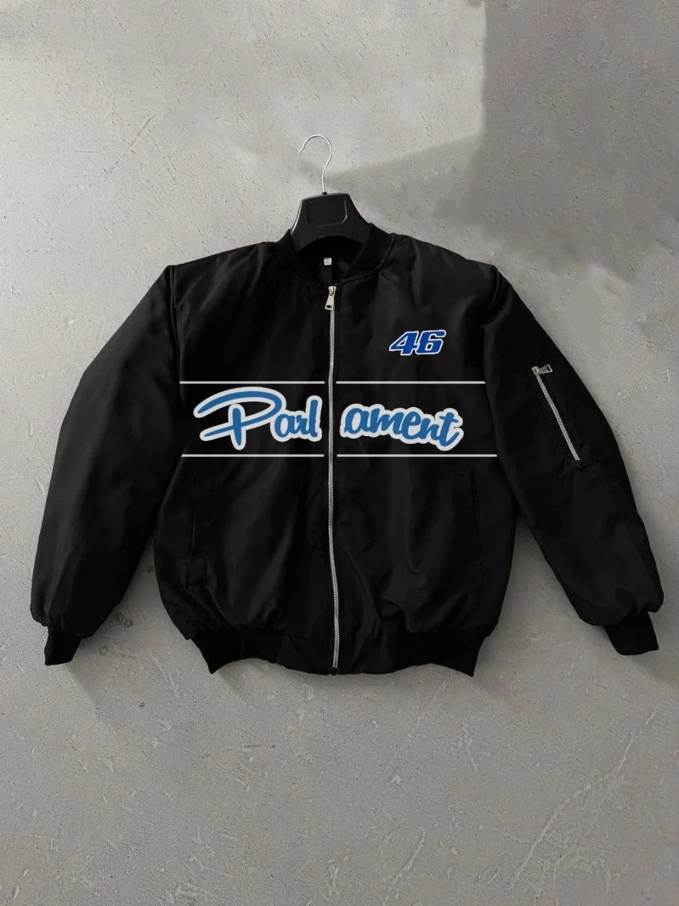 Siyah Parliament Bomber Mont – 46 Numara Detaylı, Fermuarlı, Cepli, Uzun Kollu, Spor ve Günlük Giyim İçin Rahat Unisex Mont - Siyah